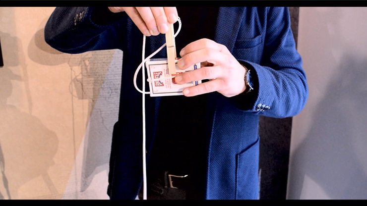 The box is thrown down by holding the end of the string and at the end the signed card will come out of the box remaining in the grip of the clothespin, while the deck is still sealed.