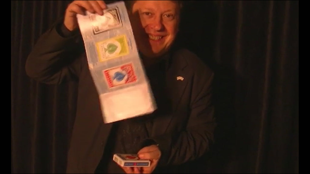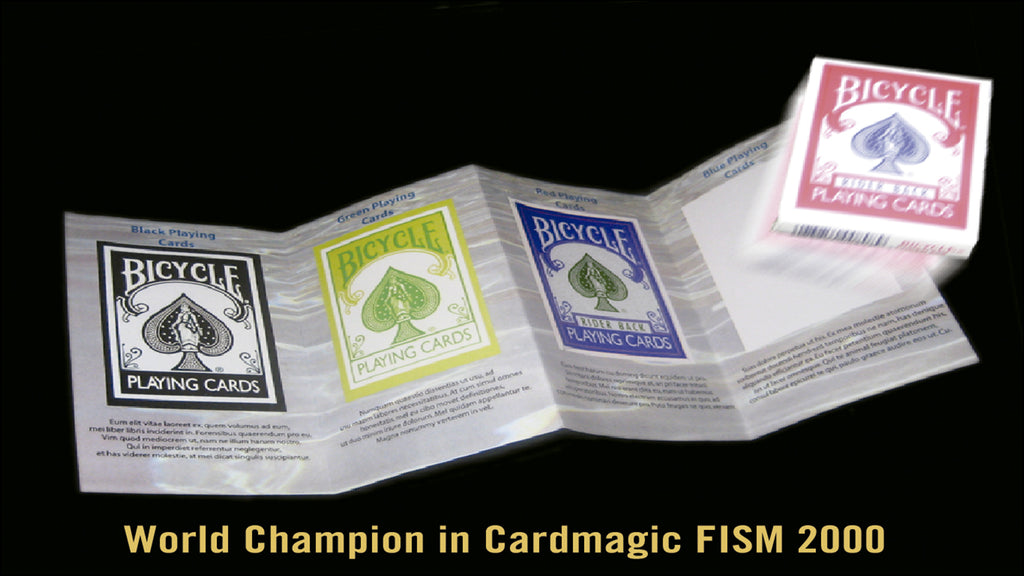 A Magician showcases a catalog of different colored deck of cards. With a little shake of the catalog, a deck of cards falls from the catalog and is ready to be used by the magician. An innovative way to introduce a deck of cards for your next routine.